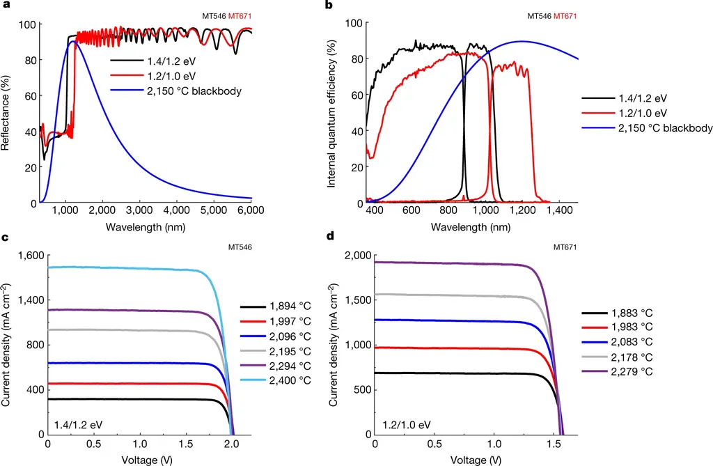 而这种新的设计旨在从更高温度的源头捕获更高能量的光子,这要归功于它使用了更高的带隙材料和多个结。在 1900 摄氏度和 2400 摄氏度之间的测试中,新的 TPV 电池保持了约 40% 的效率。早期的 TPV 电池平均效率约为 20%,此前效率最高的记录为32%。