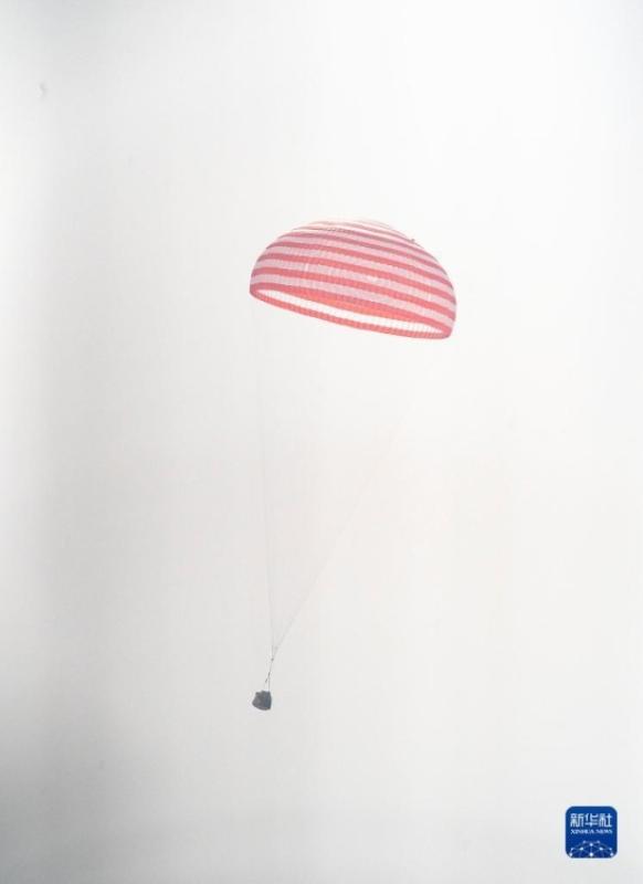 4月16日在北京航天飞行控制中心拍摄的神舟十三号载人飞船返回舱主降落伞打开画面,搭载三名航天员的返回舱下降速度减缓,即将返回地面。新华社记者 田定宇 摄