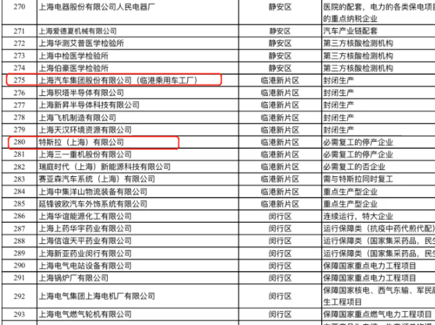 4月16日,上海市经信委发布了《上海市工业企业复工复产疫情防控指引(第一版)》,旨在有力有序有效推动企业复工复产,保障产业链供应链安全稳定。而根据复工复产名单来看,上汽集团、特斯拉均在名单之中。在名单中,与汽车相关的企业249家,整车制造商的名单里有上海大众、上汽通用、特斯拉,临港片区把特斯拉列为“必需复工的停产企业”。