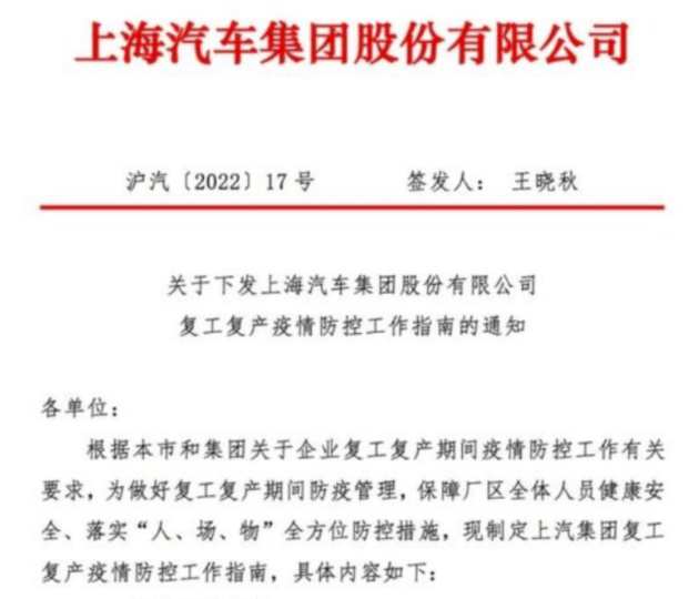 而上海汽车集团也下发了《关于下发上海汽车集团股份有限公司复工复产疫情防控工作指南的通知》(以下简称,《通知》)。