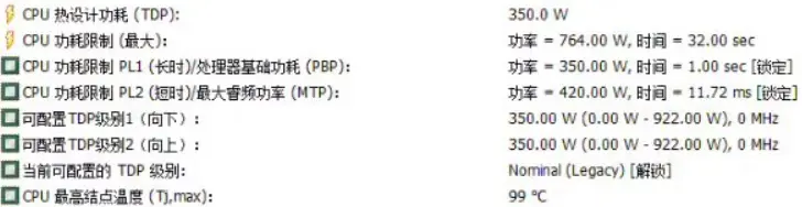至于时钟速度,英特尔 Sapphire Rapids-SP Xeon CPU 的基本时钟速度为 1.9 GHz,睿频为 3.3 GHz。该 CPU 的最大单核提升时钟为 3.7GHz。功率数字是事情变得疯狂的地方,因为在Socket E(LGA 4677)主板上运行的处理器的基本TDP为350W(PL1),最大涡轮增压功率等级(PL2)为疯狂的420W。但这还不是全部,实际的CPU(BIOS强制)功率限制报告为764W,这可能是在启用AVX-512的情况下。