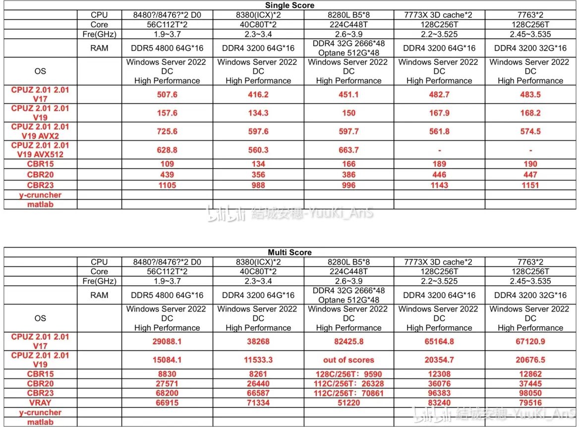 作为比较,@Yuuki_Ans 还分享了英特尔 Cascade Lake Xeon 8280L(8S 配置)、Ice Lake Xeon 8380(2S 配置)、EPYC 7763(2P 配置)和 EPYC 7773X(2P 配置)的基准测试数据。
