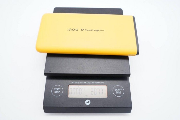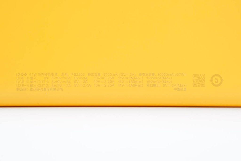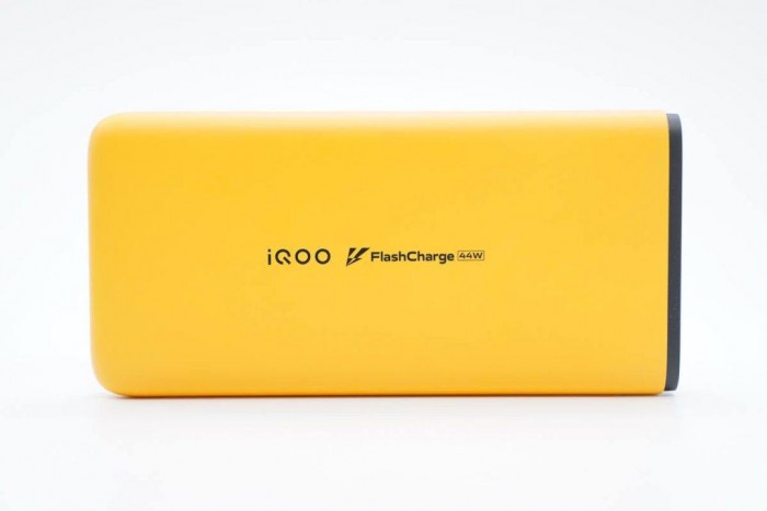 主体机身壳采用象征品牌的黄色配色,表面哑光抗指纹,正面中心设计有iQOO和FlashCharge 44W。