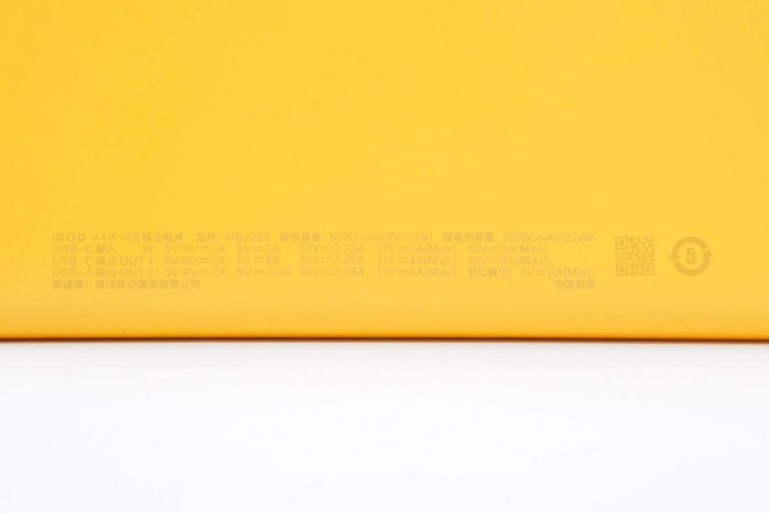 iQOO 44W闪充移动电源采用黄色外壳,辨识度高,做工精细。输出支持iQOO 44W闪充、45W PD快充、40W融合快充三大疾速快充,并且支持30W自充电,在为手机提供快速充电的同时,自身回电速度也非常快。并且支持PPS快充,对主流的Android手机充电兼容性也非常好。