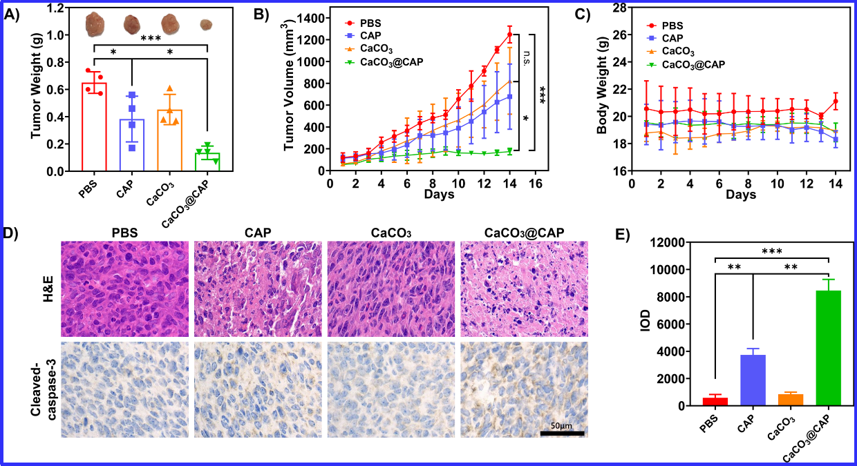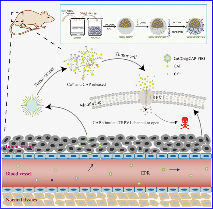 研究人员通过气相扩散制备法在合成CaCO3纳米粒子的同时装载上辣椒素,通过进一步修饰磷脂分子和聚乙二醇,成功制备出了装载辣椒素的CaCO3纳米粒子(CaCO3@CAP-PEG)。该纳米粒子具有良好的水溶液分散性和稳定性,有利于高亲脂性辣椒素通过血液积累到肿瘤组织中。另外,由于CaCO3纳米粒子良好的酸响应性,能有效地在肿瘤酸性微环境中快速裂解并释放出辣椒素分子,提高肿瘤钙离子浓度并实现特异性激活TRPV1通道。