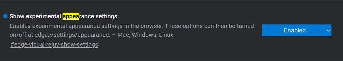 在 Microsoft Edge Canary 频道最新 102 版本更新中,引入了名为“Show experimental appearance settings.”(显示实验性外观设置)的实验 Flag,只是遗憾的是目前在启用之后并没有提供太多的新设置。