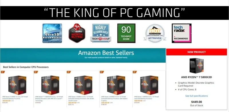 亚马逊是另一个缺少新的AMD处理器库存的零售商,但他们的电子商务网站上有趣的是没有任何价格过高的第三方列表。AMD游戏营销总监Sasa Marinkovic在LinkedIn上发布,AMD Ryzen 7 5800X3D被列在亚马逊最畅销CPU列表的第二位。