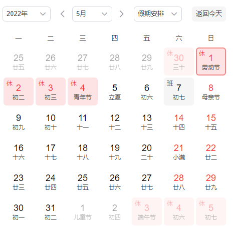 今天你上班了吗?闹钟响了吗?有没有迟到。根据官方此前发布的《关于2022年部分节假日安排的通知》,今年五一国际劳动节放假调休共5天,时间为4月30日至5月4日,4月24日(星期日)、5月7日(星期六)为正常工作日。
