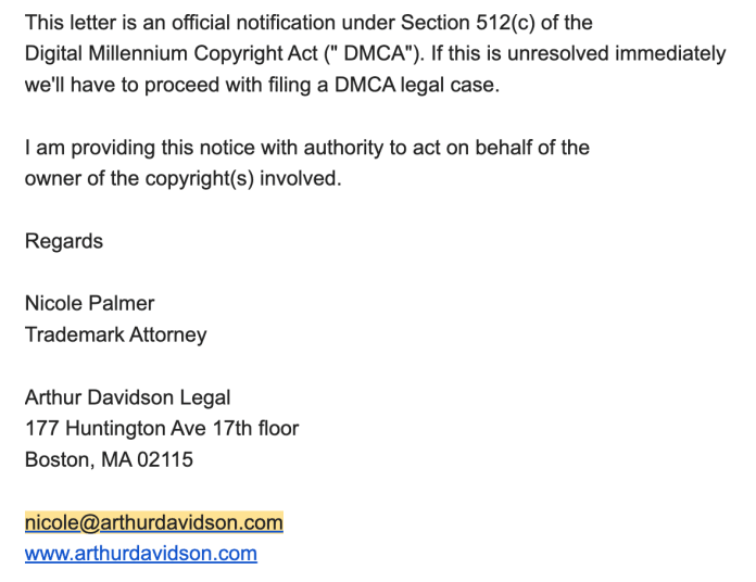 4月13日,律师给Ben发了一封“DMCA版权侵权通知”,邮件里她自称是“Arthur Davidson法律服务公司的商标律师”,并声称Ben在TechTalks网站中使用的一张图片版权属于她的一位客户。