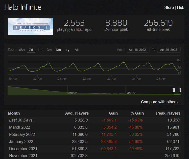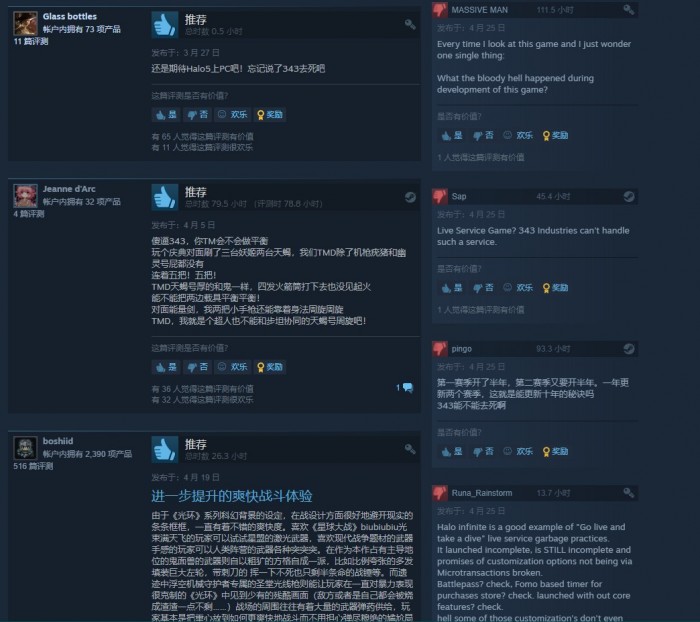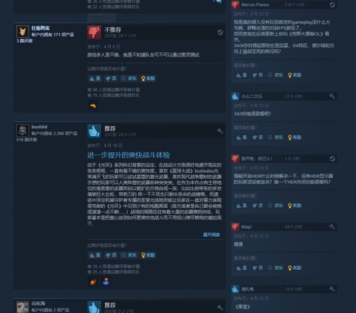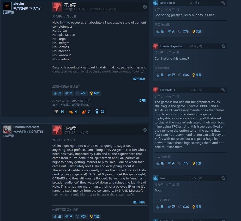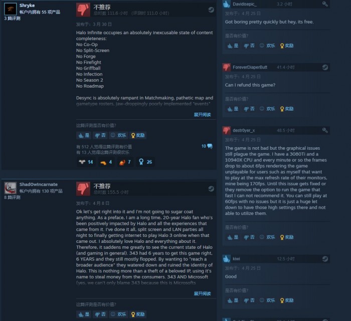 《光环:无限》免费多人模式最近在Steam上遭到了差评轰炸。如下图,可以看到从4月1日开始到4月25日(今天),本作遭到了大量负面评价,最多的一天是4月9日,有83个差评。一名游玩了48.5小时的国外用户指出,《光环:无限》游戏并不差,但画面问题仍然毁了这款游戏。虽然他有一块RTX 3080Ti显卡,但也遇到了相当频繁的掉帧问题。