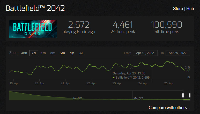 截止到发稿时,《光环:无限》当前在线玩家只有2553人,不及《战地2042》(2572人),24小时峰值仅为8880人。