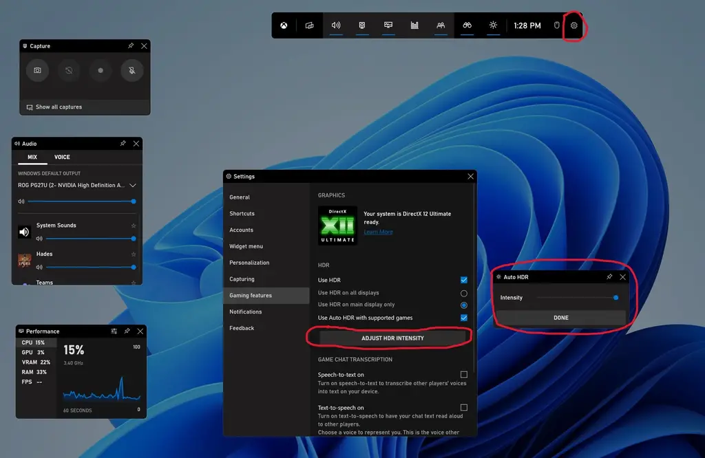 你可以使用快捷方式 Win+G 来打开 Xbox Game Bar。要使用 Intensity Slider,导航到 Xbox Game Bar,然后点击设置按钮。在设置中,点击游戏功能部分。在该部分,你会看到一个按钮,上面写着"调整HDR强度"。当你点击该按钮时,将出现一个带有强度滑块的弹出窗口。如果你想让它留在你的游戏栏叠加中,你可以按右上方的钉子按钮将其固定。这可以让你控制你的游戏中的颜色强度。