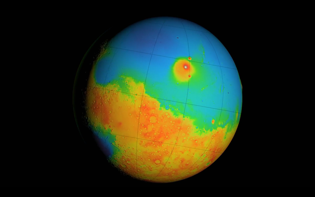 图片中,火星上那片巨大的蓝色区域是太阳系中最大的盆地。这是某次大规模撞击的结果。这个撞击被称为“北极撞击事件”。