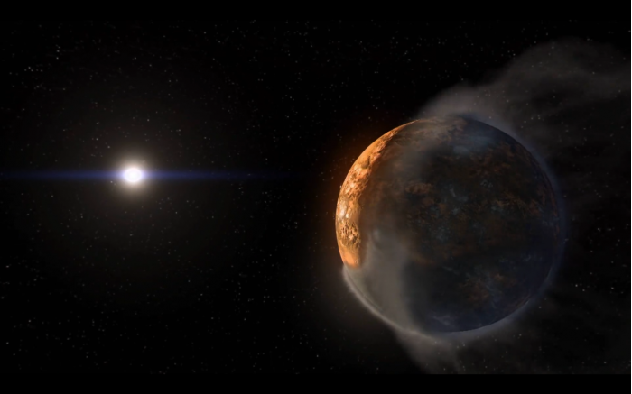 这个影响是灾难性的,它将星球近一半的表面吹入太空,并将残留的地壳变成沸腾的熔岩湖。