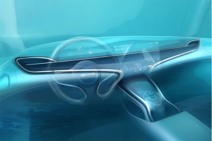 近日,比亚迪又释放了一组海豹的内饰设计渲染图。图片中可以发现,海豹的内饰将采用贯穿式的仪表台设计,中控台采用了类似“豚跃”的动感造型,同时耸立的中控台设计也让其下方具有更大的储物槽。