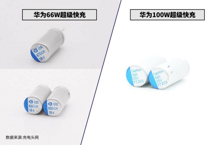 华为66W超级快充使用三颗BERYL绿宝石 CH系列固态电容滤波,两颗容量为680μF,一颗容量为470μF,总容量为1830μF。