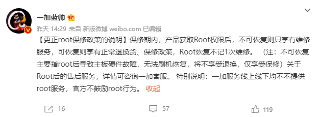 此外,该博主也明确提到,一加线上和线下均不提供Root服务,并表示官方并不鼓励Root行为。