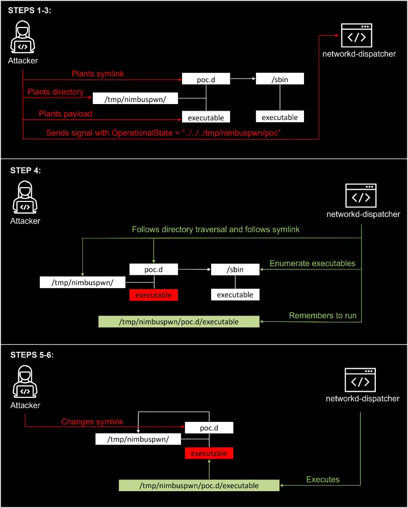 发现这些漏洞是从“监听系统总线上的消息”开始的,这促使研究人员审查 networkd-dispatcher 的代码流。微软研究员Jonathan Bar Or在报告中解释说,Nimbuspwn 的安全缺陷是指目录穿越、符号链接竞赛和检查时间-使用时间(TOCTOU)竞赛条件问题。
