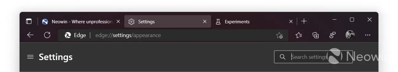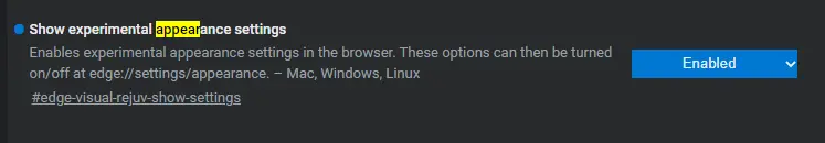 2. 打开浏览器,转到edge://flags。找到"显示实验性外观设置"标志并启用它。