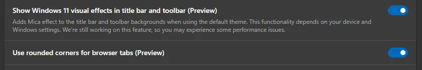 3. 重启Edge,然后进入edge://settings/appearance,打开"显示Windows 11视觉效果"和"对浏览器标签使用圆角"。