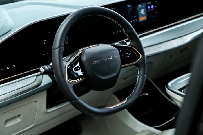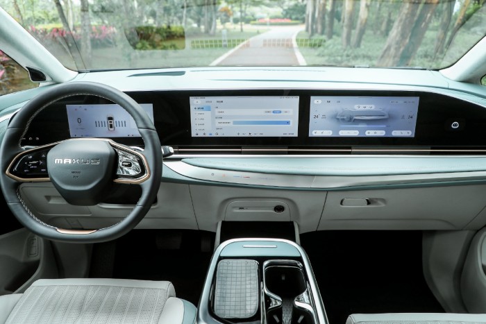 内饰同样延续了豪华、科技又大气的设计,最为吸睛的便是贯穿式三联屏设计,仪表盘、中控屏、副驾驶屏幕连为一体,中控台上还设置了触摸式的功能按键,搭配双辐式多功能方向盘以及怀挡设计,商务范儿拉满。