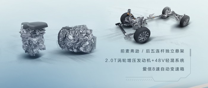 动力方面,新车全系标配2.0升涡轮增压四缸发动机+48V轻混系统,最大可输出234马力,峰值扭矩390牛米,传动系统将匹配爱信8速自动变速箱,0-100km/h加速时间仅为9.6秒。