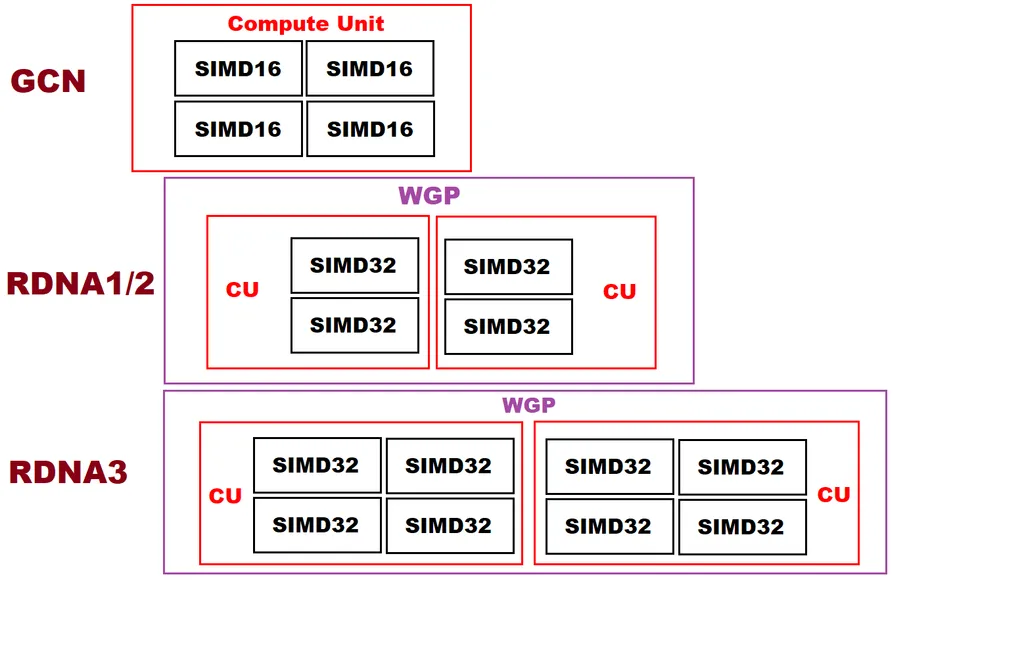 AMD 在 RDNA 1 中引入了 WGP,每个 WGP 由两个 CU 组成。因此,与 RDNA 1(RX 5000系列)和RDNA 2(RX 6000)GPU相比,RDNA 3似乎有两倍的SIMD32能力。