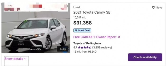 如今,在Cars车辆销售网站上,已经开了1万英里的二手2021款凯美瑞,都要卖3万1千美元。还记得之前我们提到的去年五月的此款新车价格是多少吗?2.5万美元,还有1300美元的现金返还。