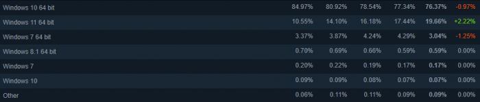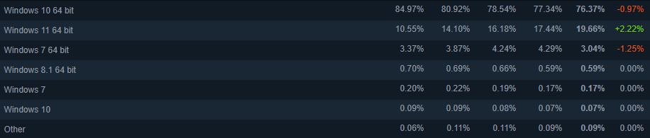 除了显卡外,此次调查报告还包含了操作系统的用户占比等数据。在过去的一个月中,Win11的用户数获得了2.22%的增长,用户占比已经逼近20%大关。