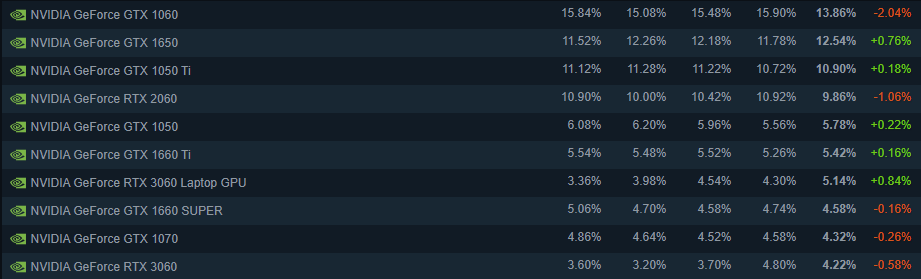 与此同时,GTX 1650获得了0.76%的涨幅,用户占比来到了12.54%,如果按此趋势,将GTX 1060从第一挤下来也不无可能。
