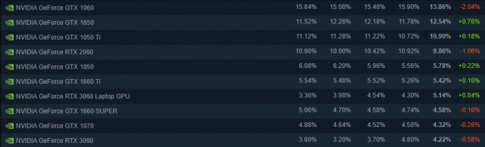 根据Steam 4月调查报告,虽然GTX 1060凭借13.86%的用户占比,依旧是使用人数最多的显卡,但与此前相比却下跌了1.03%,是前十名中下跌幅度最大的显卡。