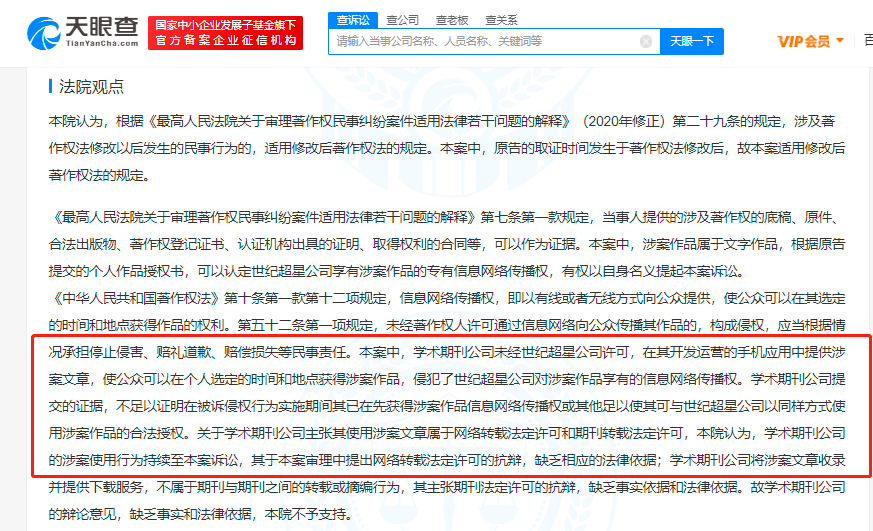 法院审理认为,学术期刊公司提交的证据,不足以证明其已在先获得涉案作品信息网络传播权或其他使用涉案作品的合法授权;学术期刊公司将涉案文章收录并提供下载服务,不属于期刊与期刊之间的转载或摘编行为,其主张期刊法定许可的抗辩,缺乏事实和法律依据。最终,法院裁定学术期刊公司赔偿世纪超星公司经济损失及维权支出合计10万余元。