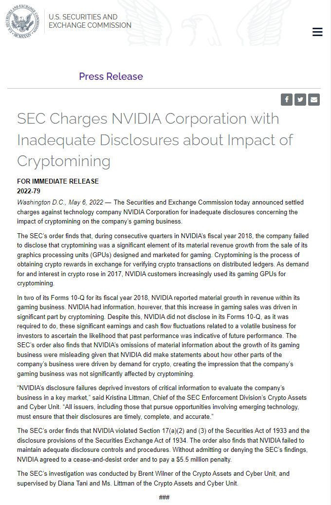 遗憾的是,英伟达一直对此事守口如瓶,仅表示加密货币是其它市场的一个重要因素,但最终被 SEC 认定为故意欺骗投资者。