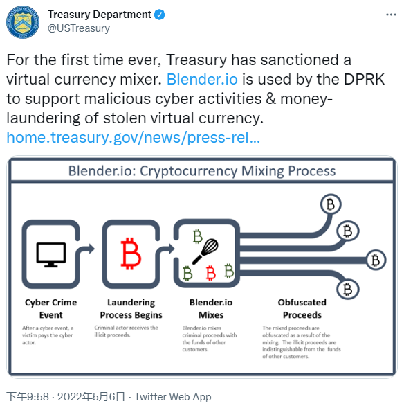 美国财政部境外资产管控办公室(OFAC)表示:因涉及为 3 月针对 Ronin Network 的网络攻击提供了交易支持,该机构将对“不当得利”的服务提供商 Blender.io 施加制裁。据悉,该 Ronin 主要负责将 Axie Infinity 在线游戏连接到以太坊区块链上,但黑客组织 Lazarus Group 对其造成了超过 6.2 亿美元的损失。