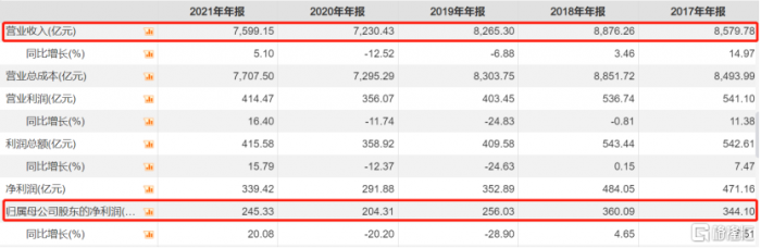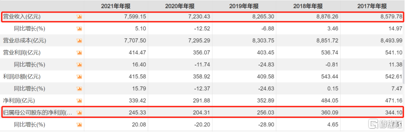 净利润方面,同样也没有恢复到疫情前水平。2021年归母净利润较2019年少了约11个亿,比2018年和2017年更是少了100个亿!