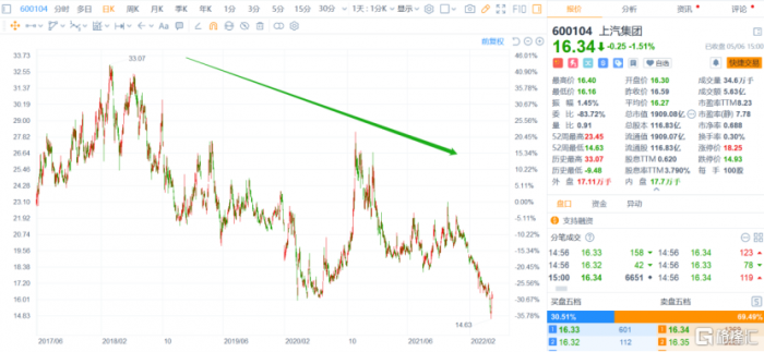 很明显,上汽集团2021年业绩看似大涨,但实际上未恢复至疫情前水平,距离2018年业绩与股价的巅峰时期有很大的差距。