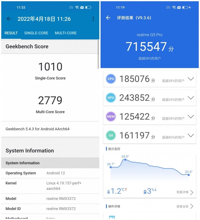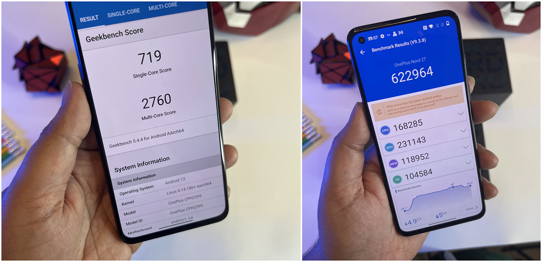 今天,爆料人@KaroulSahil在社交平台上曝光了一加Nord 2T的真机谍照以及跑分情况。一加Nord 2T全球首发联发科天玑1300处理器,其Geekbench单核成绩为719,多核成绩为2760。与高通骁龙870相比,天玑1300的多核成绩与骁龙870相差不大,单核成绩不及骁龙870。