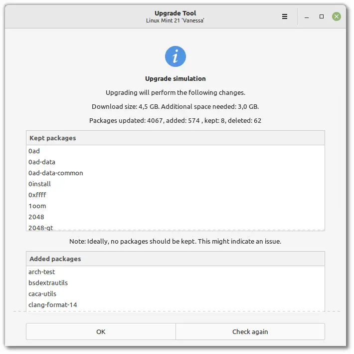 在升级过程中,你会被要求确保你已经安装了所有可用的更新,并在出现问题时用系统快照进行了备份。由于这是一次重大的升级,Mint团队强调,你要慢慢来,并严格按照规定来做。