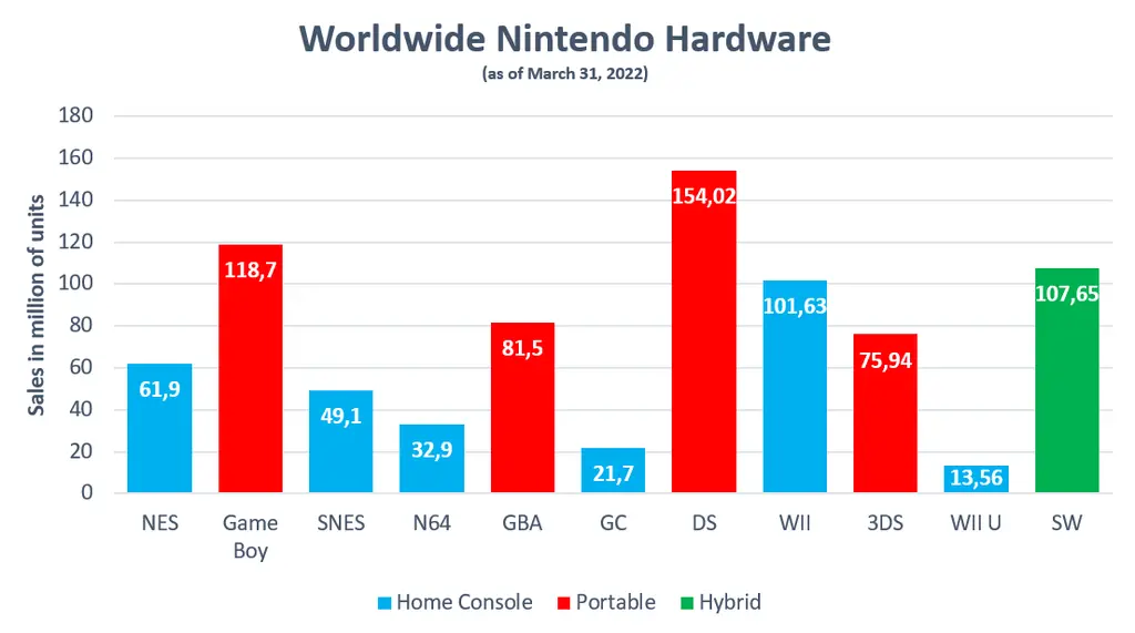 自2017年3月推出以来,任天堂目前已累计出货 1.0765 亿台 Switch 游戏机。它是该公司最成功的家用游戏机,最近超过了Wii,尽管如果你认为它是一个掌机系统,它仍有一些路要走,以赶上任天堂 DS 的数字 1.5402 亿台或 Game Boy 的 1.1869 亿台。