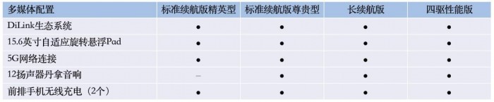 另外海豹全系将搭载15.6英寸的自适应旋转悬浮Pad,并内装最新的DiLink生态系统,支持5G网络连接。另外海豹全系都将有2个前排无线充电,同时除入门级版本外,其它三个版本均配备12个扬声器的丹拿音响系统,这两项配置的标配情况在目前市面上也非常少见。