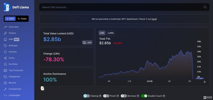 根据DefiLlama的数据,在经历了市场大幅度缩水后,Terra的TVL仅为28.5亿美元:Anchor为17.9亿美元,Mirror为1.56亿美元,Lido为1.42亿美元。