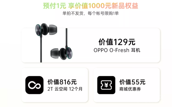 目前,官网上并没有披露任何有关于这款平板的配置信息,不过给出了一个优惠政策“预付1元,享受价值1000元新品权益”。据CNMO了解,这1000元权益包含了一个价值129元的OPPO O-Fresh有线耳机、价值816元的12个月2TB云空间以及价值55元的商城优惠券。总的来说,这些优惠有些还是比较实用的,例如2TB云空间。