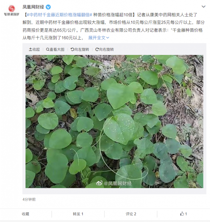 广西灵山冬林农业有限公司负责人还表示:“千金藤种苗价格从每斤十几元涨到了160元以上,部分小公司报价甚至达到二三百元。”