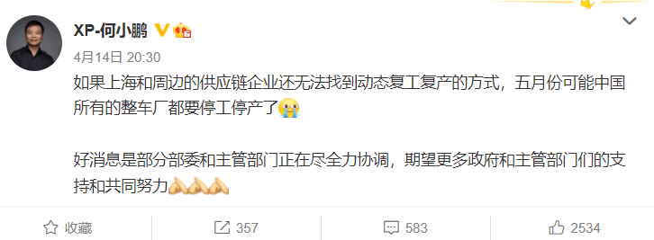 华为余承东就何小鹏的发言,也在朋友圈发文:上海如果不能复工复产,5月之后所有科技/工业产业涉及上海供应链的,都会全面停产,尤其是汽车产业!经济损失/代价将会很大!4月中旬开始,部分企业就已经开始因上海等封闭导致供应链断供停产了。