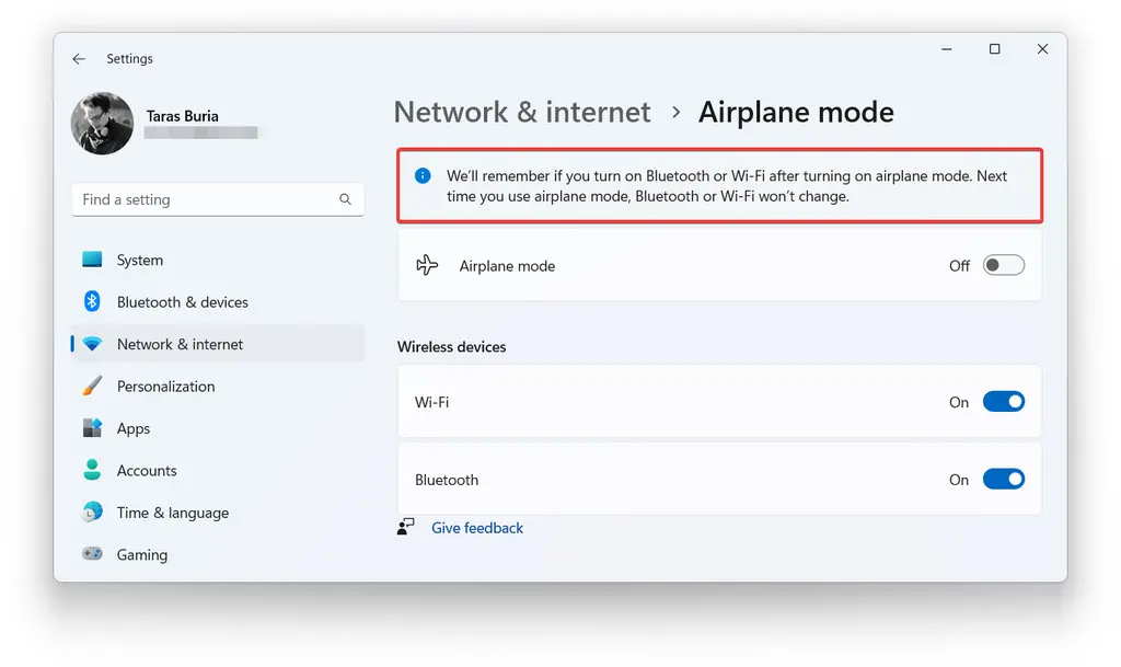 Windows 可以记住飞行模式下可用的无线电的状态,以便在下次切换模式时保持它们的运行。