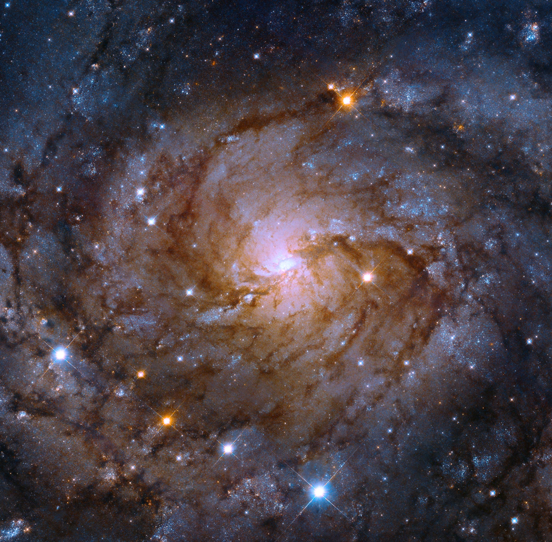 螺旋星系IC 342--也被称为Caldwell 5,距离地球约1100万光年。哈勃捕捉到了这个星系中心闪闪发光的正面视图。在图片可以看到交织的灰尘卷轴,另外,一个由热气和恒星组成的明亮核心意外抢眼。