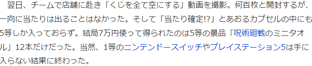 •HIKARU亲自前往该店铺,花费了7万日元全部买空了抽奖券,结果喜闻乐见,中是中了,不过全是五等奖,“咒术回战的迷你毛巾”12个,而标称的一等奖Switch与PS5游戏机当然不见踪影。