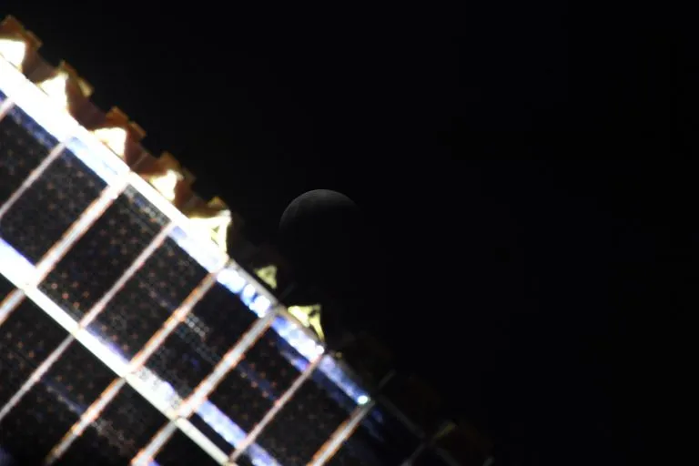 在这些图片中,月球似乎在与国际空间站的一个太阳能电池板“玩捉迷藏”。