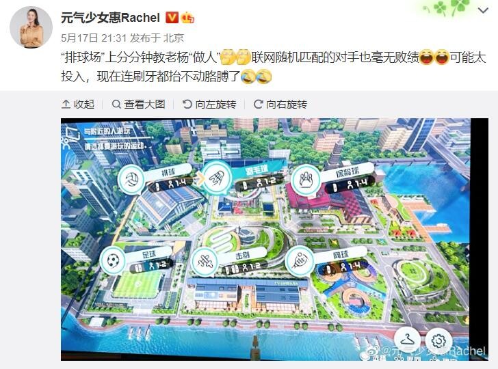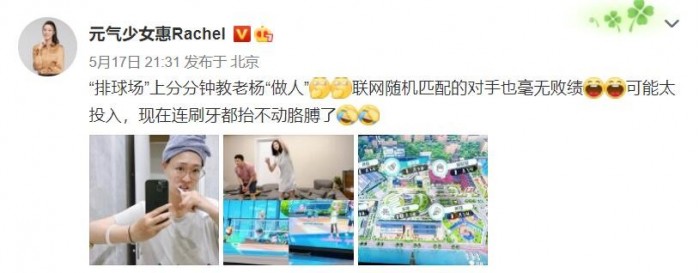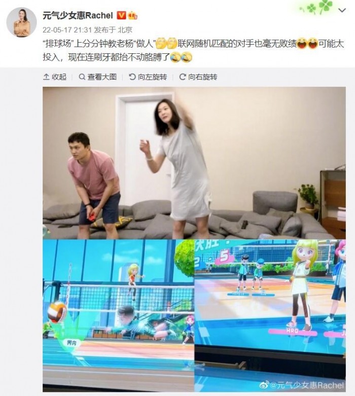 隔着一层网络,你永远不知道对面是谁在跟你打游戏。近日,中国女排运动员惠若琪在微博晒出自己游玩《NS Sports》的照片。虽然游戏里她还是名“新手”,但凭借现实中高超的技巧,场上分分钟教丈夫老杨“做人”,而联网对战也是毫无败绩。不过由于玩得太投入了,她表示现在自己连刷牙都抬不动胳膊了。