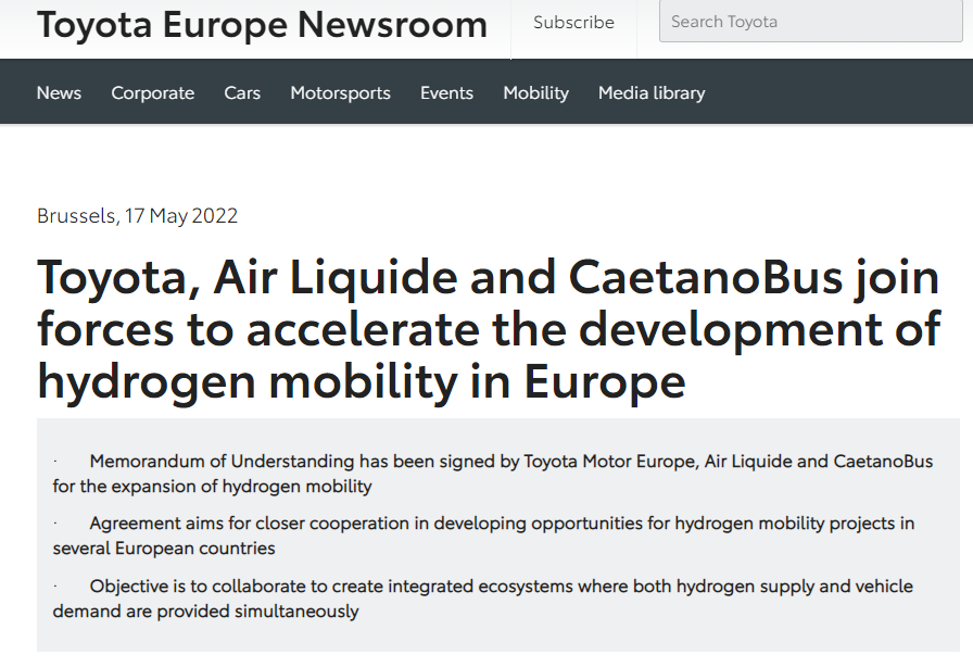 随着开发低排放和零排放汽车的竞争升温,丰田汽车(TM.US)欧洲公司、葡萄牙客车制造商CaetanoBus和法国液化空气公司(Air Liquide)签署了一项基于氢能源的运输方案发展协议。这些公司将开展氢能相关多个领域的合作,包括与分配和加油相关的基础设施建设、低碳和可再生氢生产以及在多种车型中应用氢能。